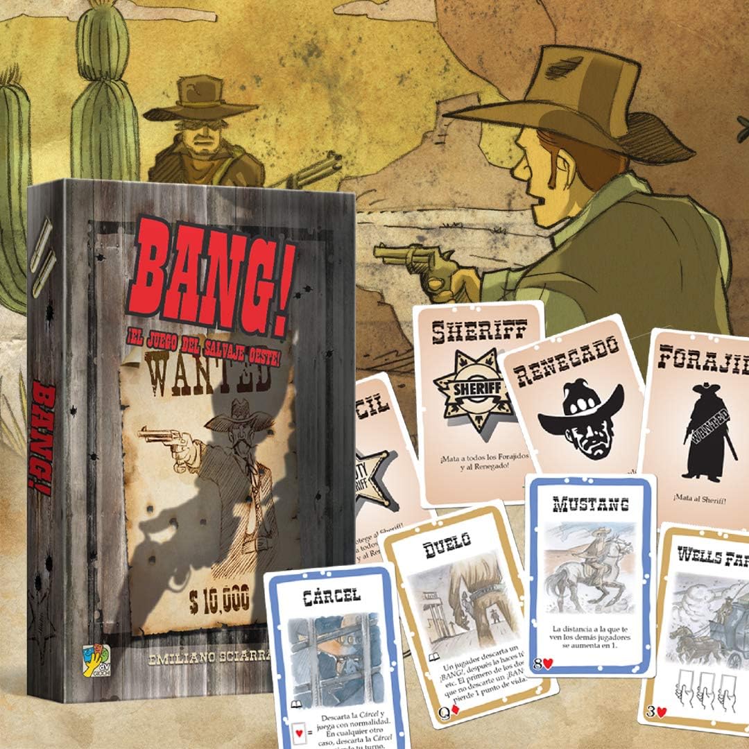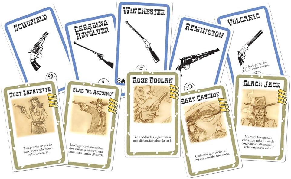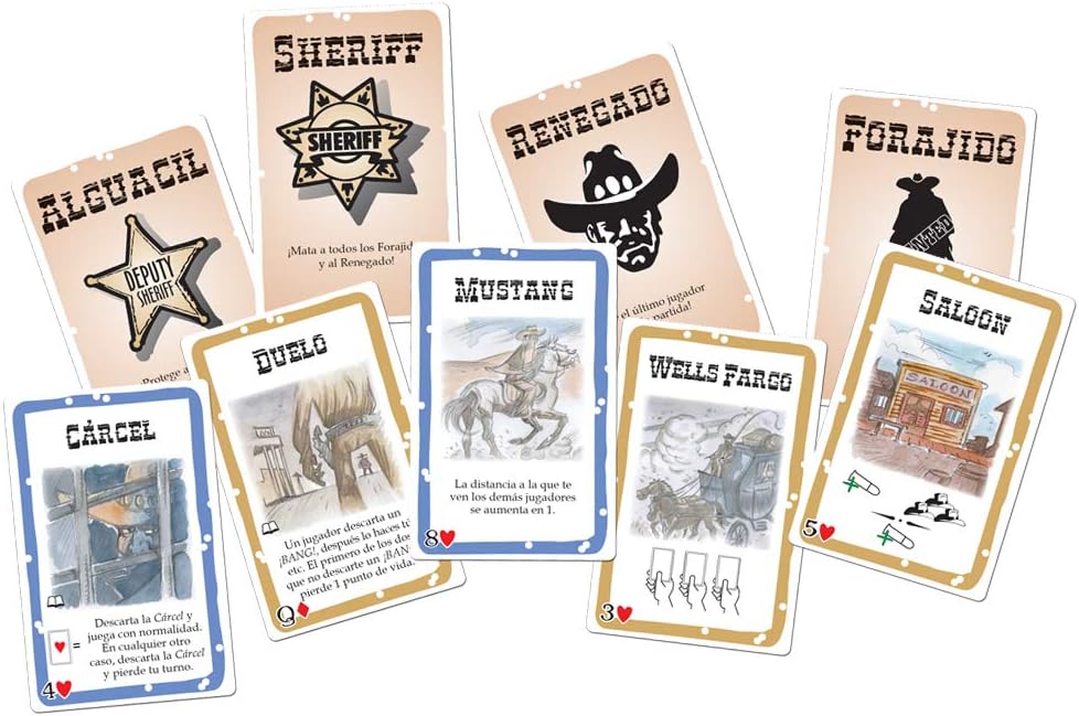 Contiene: 7 cartas de roles, 26 cartas de personaje, 80 cartas de juego, 7 cartas de resumen, 7 tableros de juego, 30 balas de madera y un libro de reglas.
